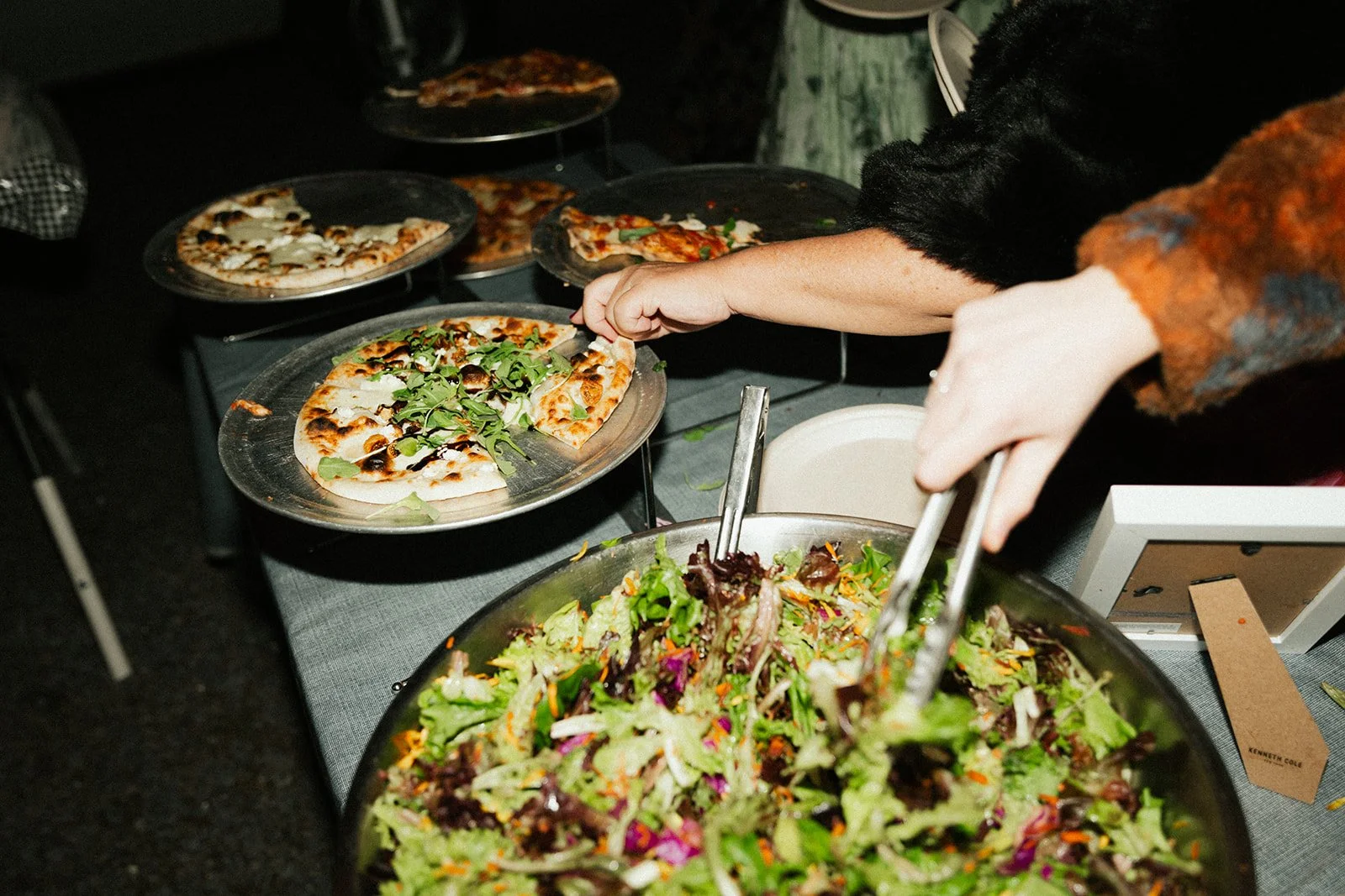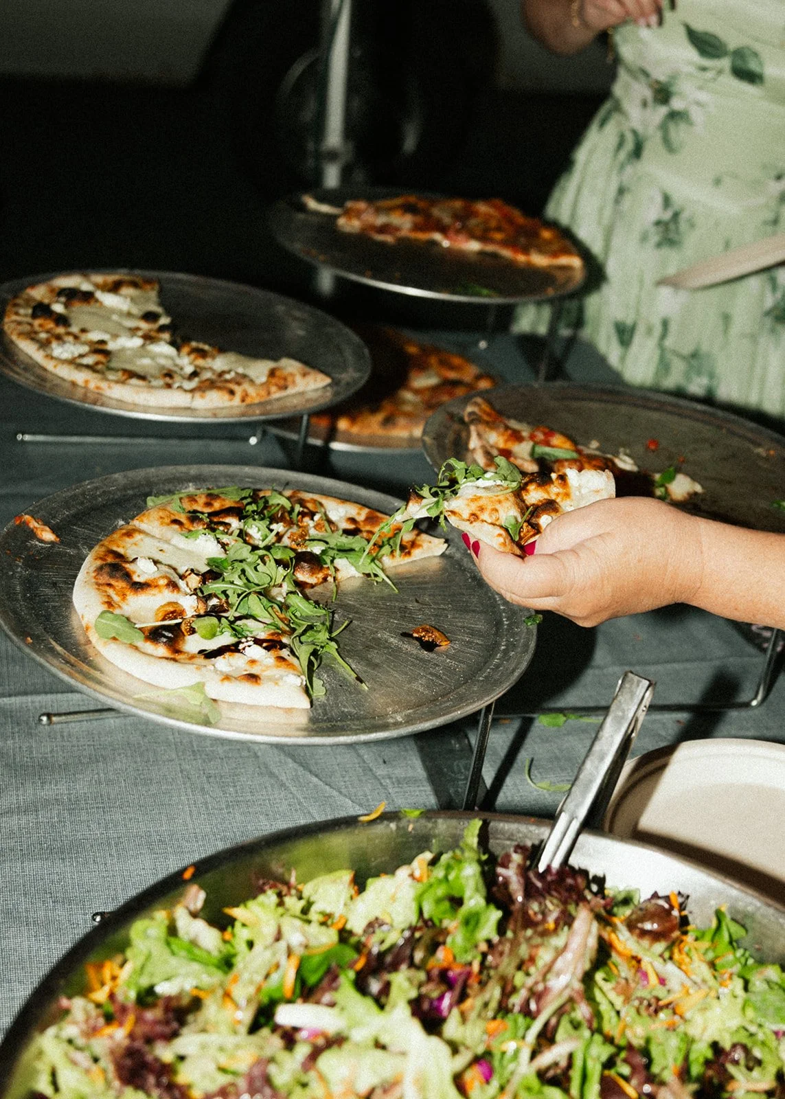 So instead of a traditional plated meal, we created a food truck alley behind the pavilion where guests could wander and grab dinner from a variety of trucks. The lineup included dumplings, wood-fired pizza, burgers, and fries, something for everyone.