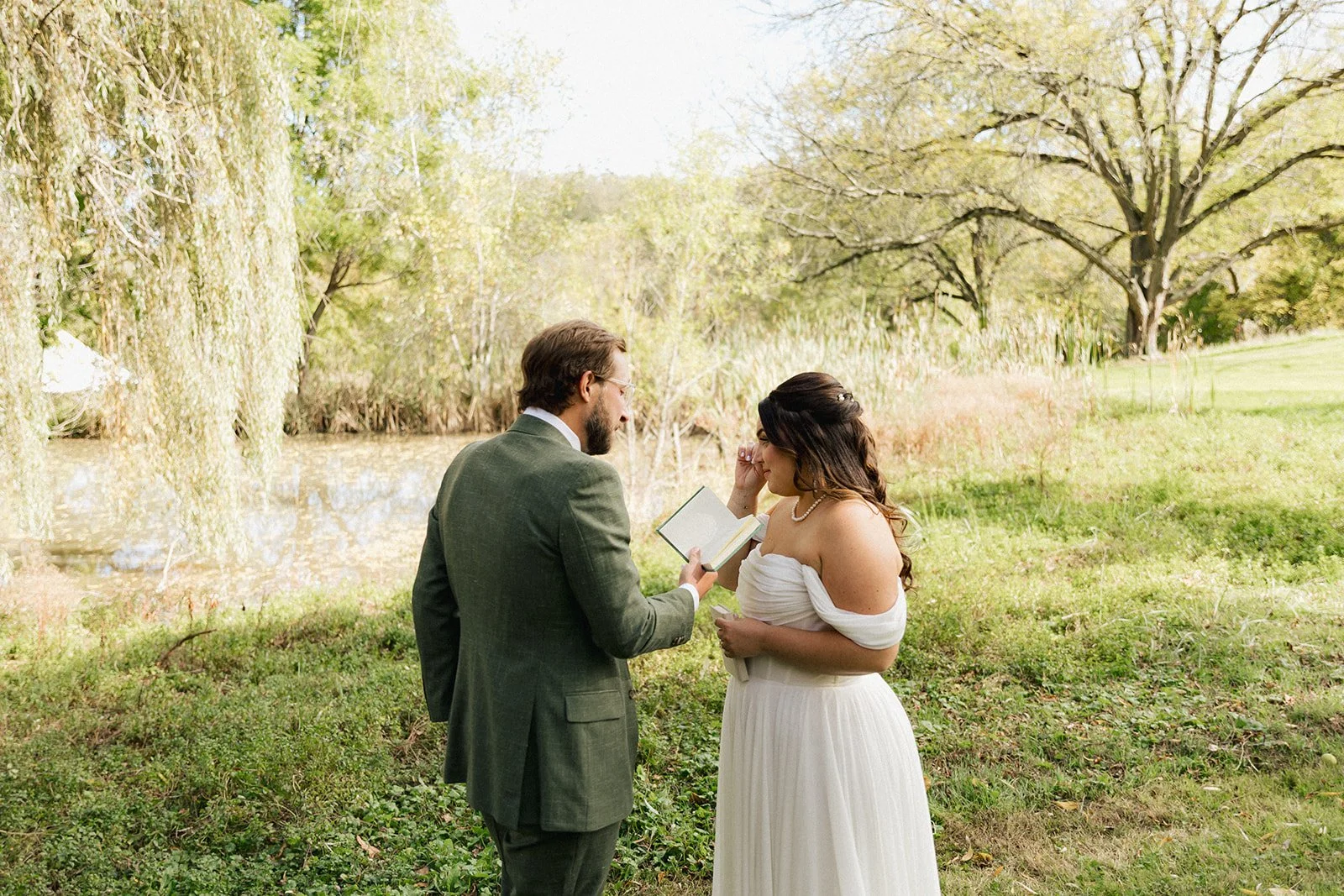 The morning of the wedding unfolded slowly, with Emily and Mark opting get ready in the farmhouse followed by a first look and private vows before the ceremony. These quiet moments together allowed them to connect away from the crowd and settle into the day.